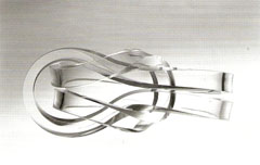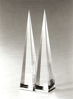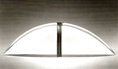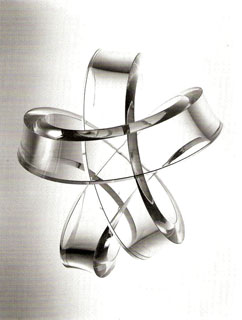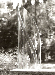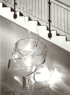 | Zu den Skulpturen von Sinda Dimroth: Visionen von Klarheit und Harmonie. Sinda Dimroths Entscheidung für das Acrylglas geschah bewußt: Sie suchte einen Stoff, der die Schwerelosigkeit der modernen Architektur mit ihren Glasfassaden und glänzenden Flächen versinnbildlicht. Zu den gestalterischen Vorlieben der Künstlerin zählen prismatische Objekte und Bänder, die als Knoten oder Spirale gewunden werden. Diese Formengruppen drücken die konträren Eigenheiten des Werkstoffes, einmal seine kristalloide Erscheinung und zum anderen seine weiche Anmut in der Bewegung aus. Als monumentale Skulptur am Bau erfährt die Acrylglasplastik eine neue Bedeutungsdimension: sie wird zum Reflektor der Tages- und Nachtzeiten. Das Spiel des reflektierten Lichts und der Spektralfarben am Baukörper ist ein nicht enden wollendes Faszinosum. Dr. Barbara Rollmann |